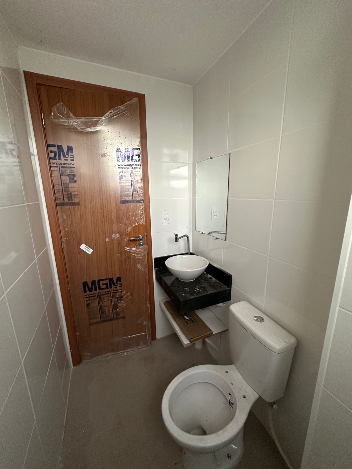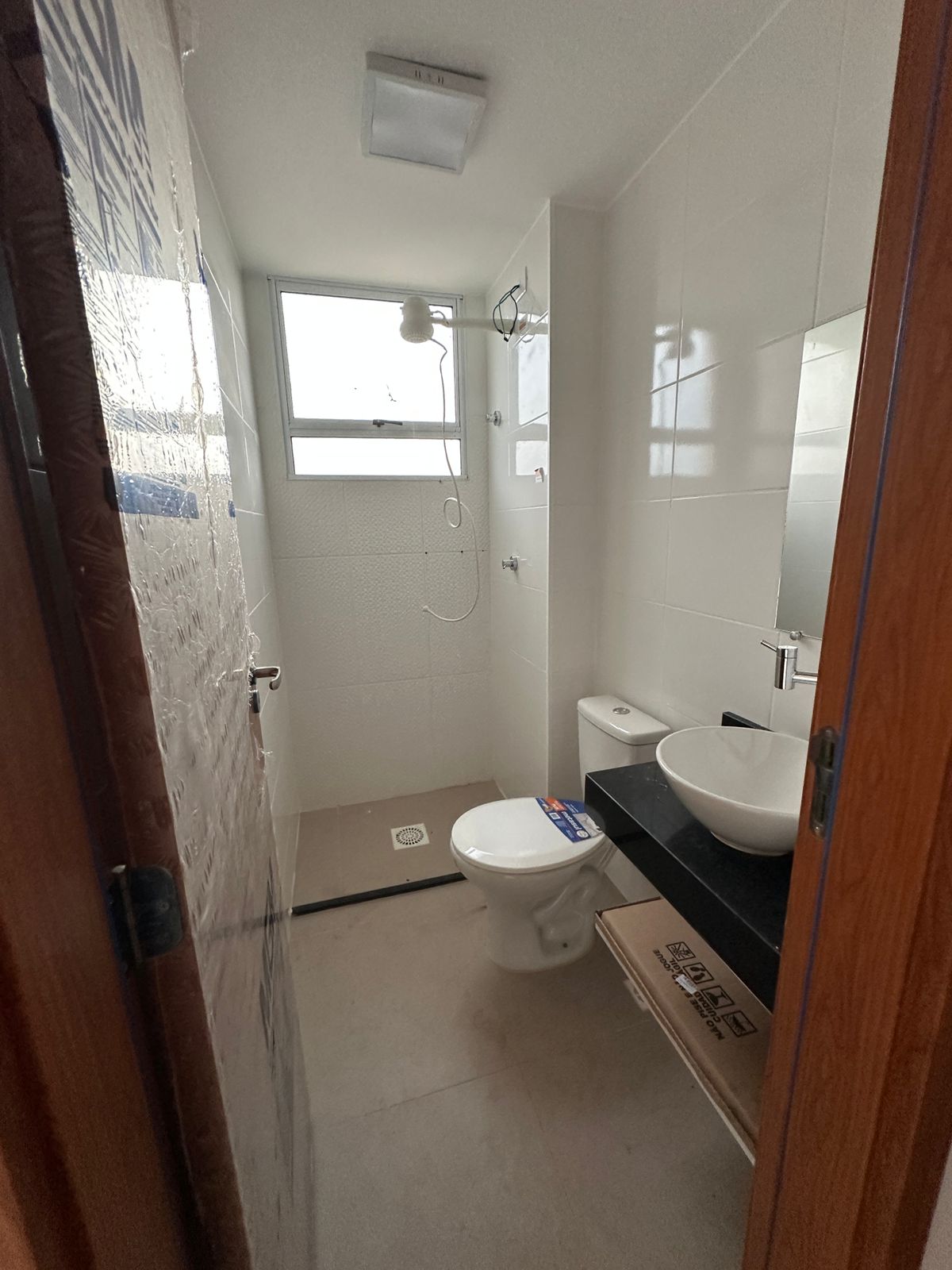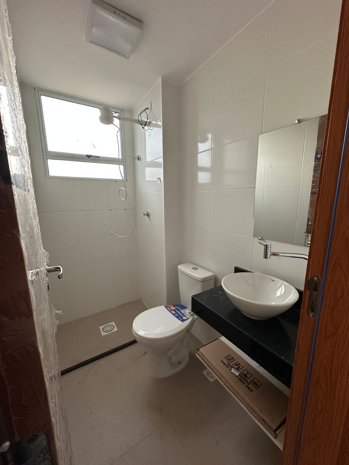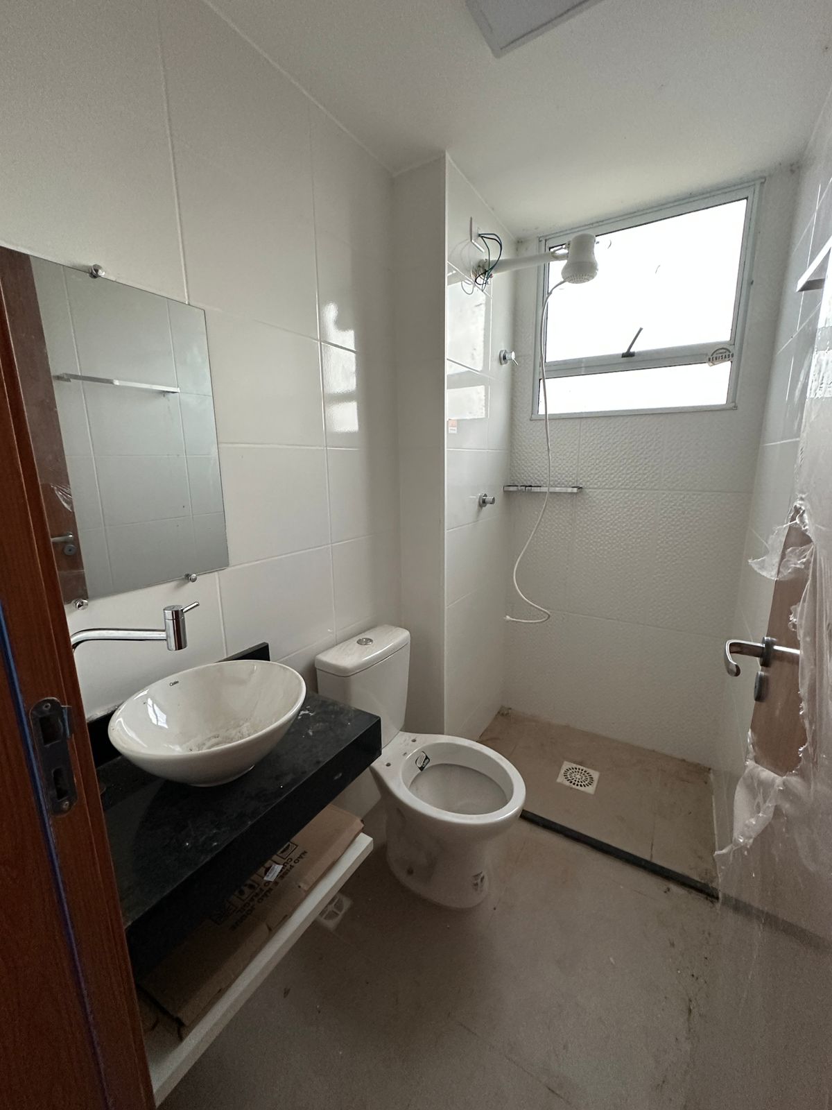 Banheiros com acessórios, espelhos, prateleiras, chuveiros elétricos e lâmpadas instaladas.